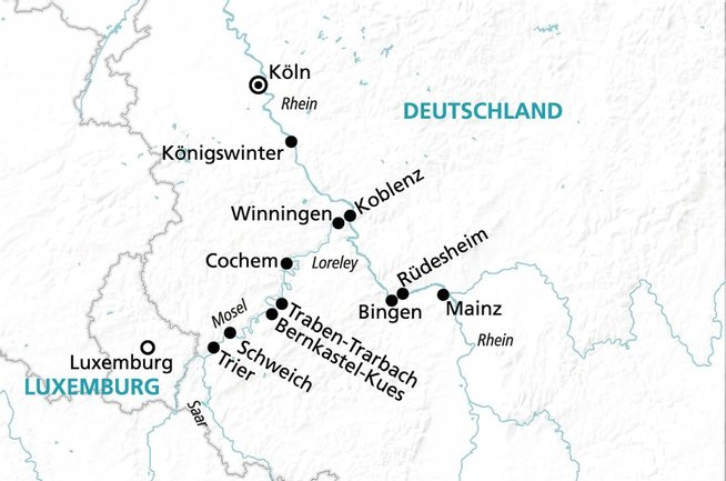 - Köln - Königswinter - Cochem - Traben-Trarbach - Trier - Bernkastel-Kues - Winningen - Koblenz - Rüdesheim - Mainz - Köln