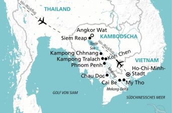 Es erwartet Sie eine außergewöhnliche Kombinationsreise durch Vietnam und Kambodscha. Während Ihrer Kreuzfahrt auf MS Lan Diep lässt es sich besonders gut entschleunigen. Sie kreuzen auf dem Mekong, durch kleine Kanäle und Wasserstraßen und besuchen verschiedene landestypische Dörfer entlang der Ufer. Wir nehmen Sie im Anschluss mit zu den schönsten Tempeln, wie z.B. der bekanntesten Anlage Angkor Wat in Siem Reap, und zeigen Ihnen das wirtschaftliche Zentrum Vietnams - Saigon/Ho-Chi-Minh-Stadt. Sie können Ihre Reise mit einem Stopover in Bangkok oder einem Badeaufenthalt in Phuket verlängern. Nähere Informationen - ein Anruf genügt!