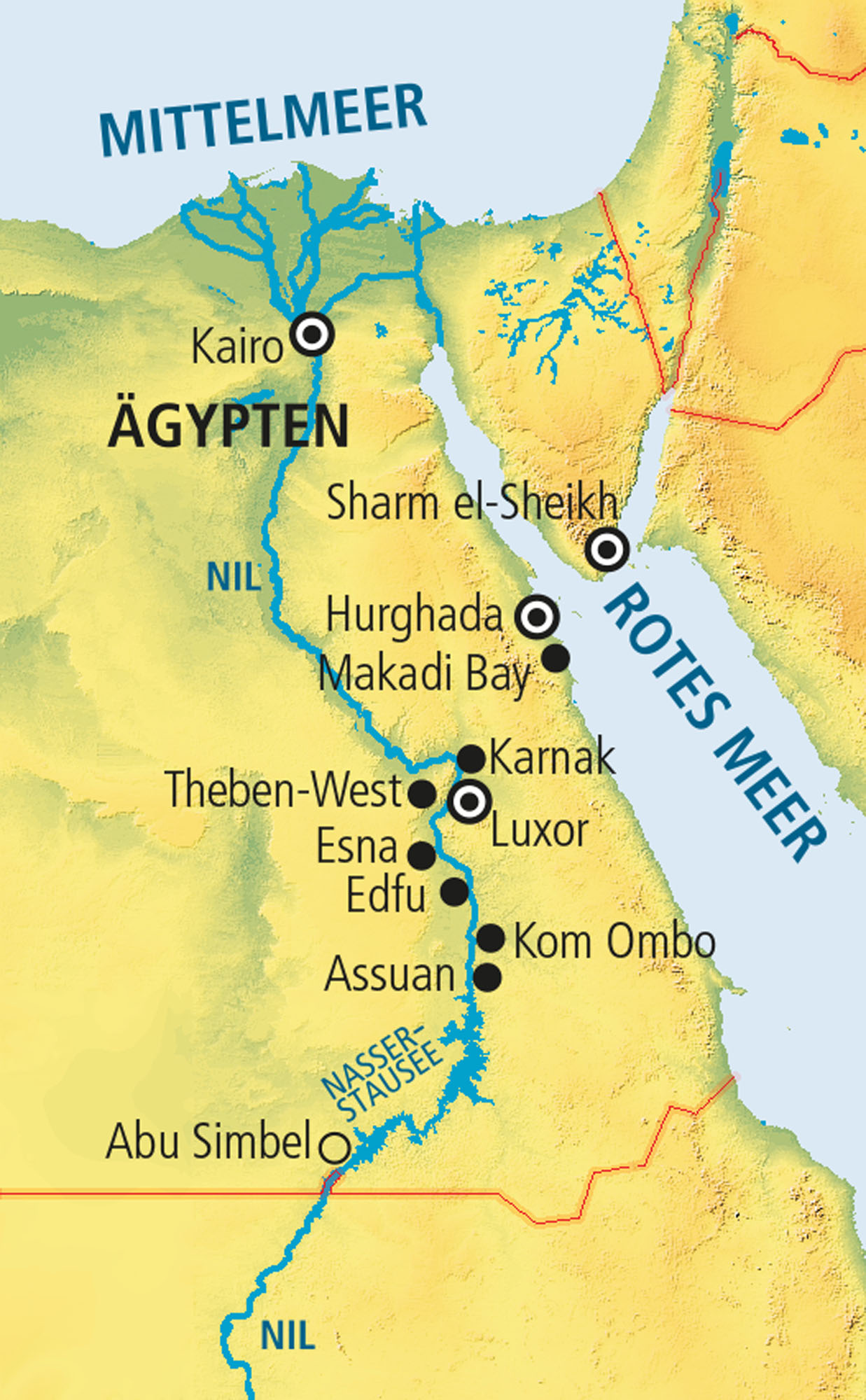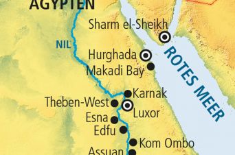 | Tag 1 | Hinflug nach Ägypten | Anreise vom Abflughafen Frankfurt nach Luxor. Empfang durch die Reiseleitung vor der Zollabfertigung und Transfer zur Einschiffung auf Ihr Nilschiff. |