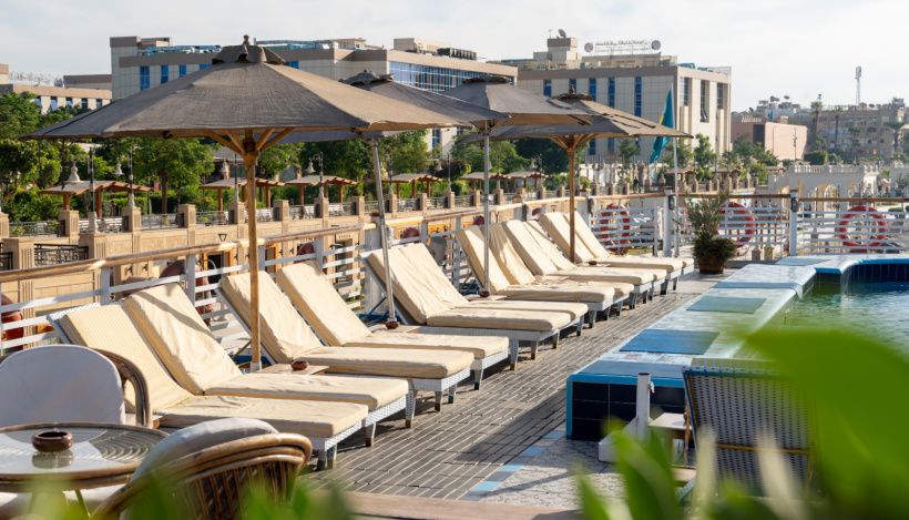 Die Nilkreuzfahrtschiffe ähneln sich in Konzeption und Bauweise, unterscheiden sich aber in Größe, Anzahl und Ausstattung der Kabinen. Phoenix Reisen greift bei der Auswahl seiner Nilflotte auf unterschiedliche Partner/Reedereien zurück, die durch eine langjährige Zusammenarbeit bestens auf die Ansprüche unserer Gäste einzugehen wissen und über eine große Erfahrung zu den Abläufen unserer Programme verfügen. Unsere Mitarbeiter vor Ort legen gemeinsam mit unserer ägyptischen Agentur großen Wert auf den Zustand der eingesetzten Schiffe, die durch regelmäßige Kontrollen und Abnahmen den Anforderungen innerhalb der von uns beschriebenen Kategorien entsprechen müssen. Dafür sind Renovierungs- und Instandhaltungsmaßnahmen seitens unserer Partnerredeereien notwendig, die in gewissen Abständen für die unterschiedlichen Teilbereiche eines Schiffes durchgeführt werden. Die Schiffe werden dadurch regelmäßig den aktuellen Standards angepasst. Bei einer gängigen Bauweise von 4-5 Passagierdecks ist i.d.R. je nach Schiff nur die Anordnung der öffentlichen Bereiche von Restaurant und Salon mit Lounge/Bar auf verschiedenen Decks unterschiedlich. Das während einer Nilkreuzfahrt im Mittelpunkt stehende Sonnendeck des Schiffes verfügt über eine Außenbar, einen kleinen Swimmingpool und ausreichend Liege- und Sitzplätze zum Sonnenbaden oder als Schattenplatz. Welches Schiff an welchen Wochentagen zum Einsatz kommt, hängt jeweils vom Buchungsaufkommen ab und wird von unserer örtlichen Agentur eingeteilt. Pool und Sonnendeck MS Nile Vision