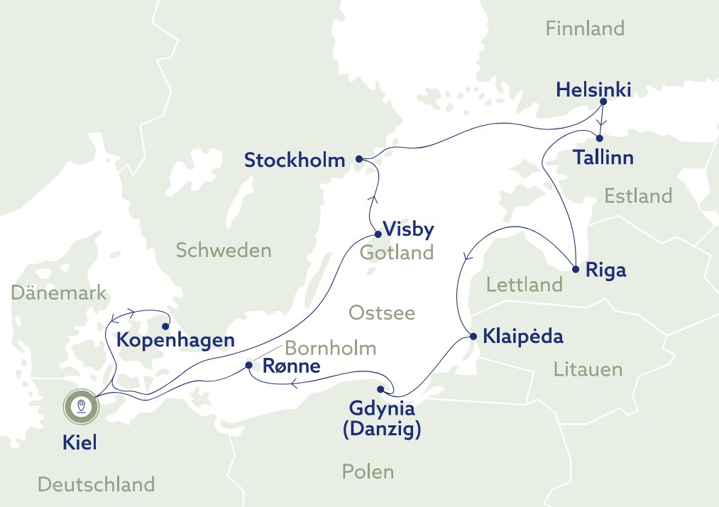 Kiel - Kopenhagen - Gotland - Stockholm - Helsinki - Tallinn - Riga - Klaipėda - Danzig - Bornholm - Kiel
