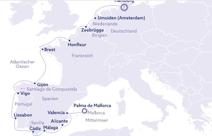 Hamburg - Amsterdam - Zeebrügge - Honfleur - Brest - Gijón - Vigo - Lissabon - Cádiz - Málaga - Alicante - Valencia - Palma de Mallorca