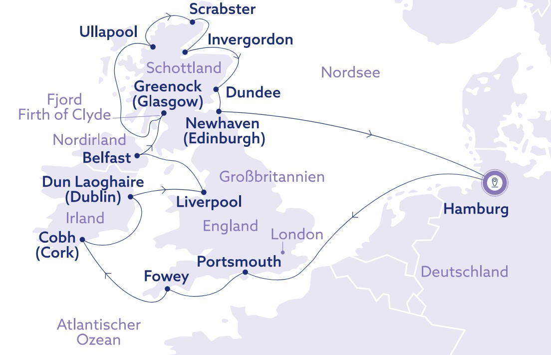 Hamburg - Portsmouth - Fowey - Cork - Dublin - Liverpool - Belfast - Glasgow - Ullapool - Scrabster - Invergordon - Dundee - Edinburgh - Hamburg