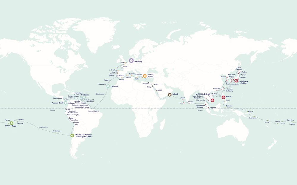 Hamburg - Teneriffa - Barbados- Panama-Stadt - Santiago de Chile - Tahiti - Manila- Tokio - Ho-Chi-Minh-Stadt - Salalah - Athen - Hamburg