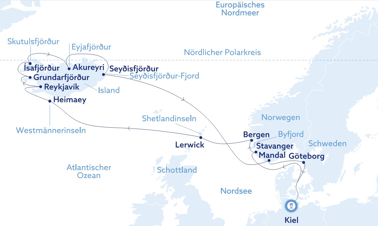 Kiel - Stavanger - Bergen - Shetlandinseln - Westmännerinseln - Island - Mandal - Göteborg - Kiel