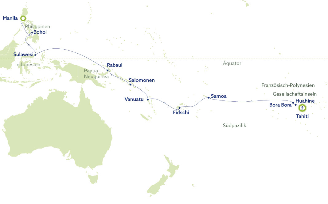 Nach dieser Traumkreuzfahrt werden Sie die Südsee besser kennen als die meisten anderen Menschen auf der Welt – dank ausreichend time to discover! Von Tahiti ausgehend, verweilen Sie zunächst noch ein bisschen auf den Gesellschaftsinseln, bevor Sie Bora Bora einen Besuch abstatten. Sie werden es schon von weitem an seinem Vulkan erkennen! Auf dem Weg nach Samoa unternehmen Sie eine kleine Zeitreise: Weil wir die Datumsgrenze überqueren, überspringen wir einen ganzen Tag. Doch keine Sorge! Ihnen bleibt auf Fidschi, Vanuatu und den Salomonen trotzdem ausreichend Zeit, die Südsee in vollen Zügen zu genießen, bevor Sie in Papua-Neuguinea, auf Sulawesi und den Philippinen weitere Abenteuer erleben!
