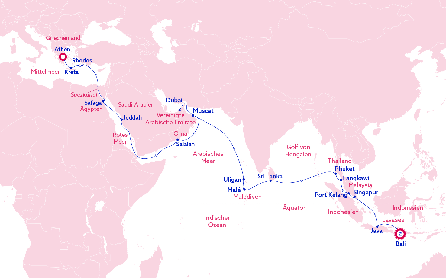 Bali - Java - Singapur - Malaysia - Phuket - Sri Lanka - Malediven - Oman - Dubai - Oman - Saudi-Arabien - Ägypten - Rhodos - Kreta - Athen