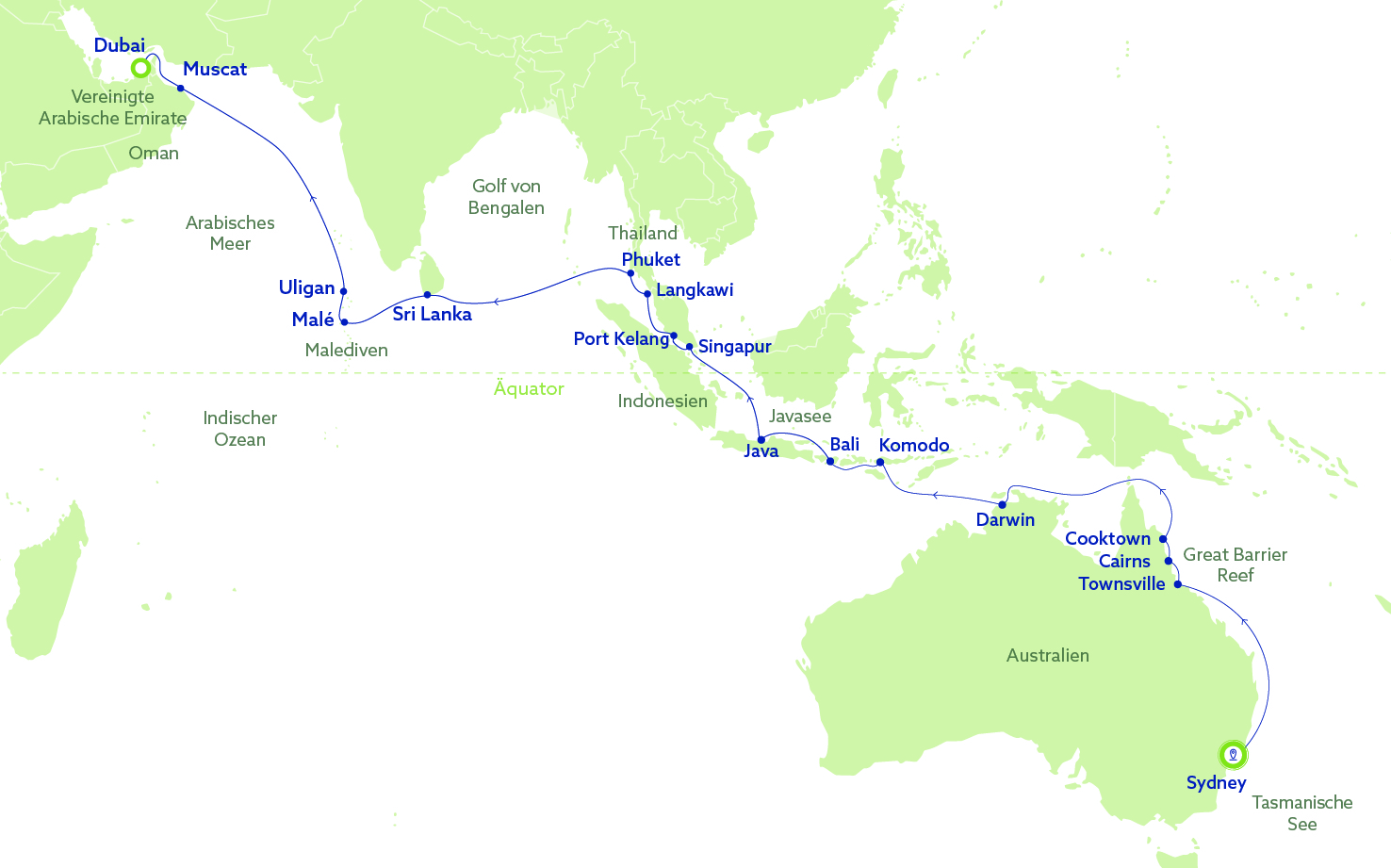 Sydney - Townsville - Cairns - Cooktown - Darwin - Komodo - Bali - Java - Singapur - Malaysia - Thailand - Sri Lanka - Malediven - Oman - Dubai