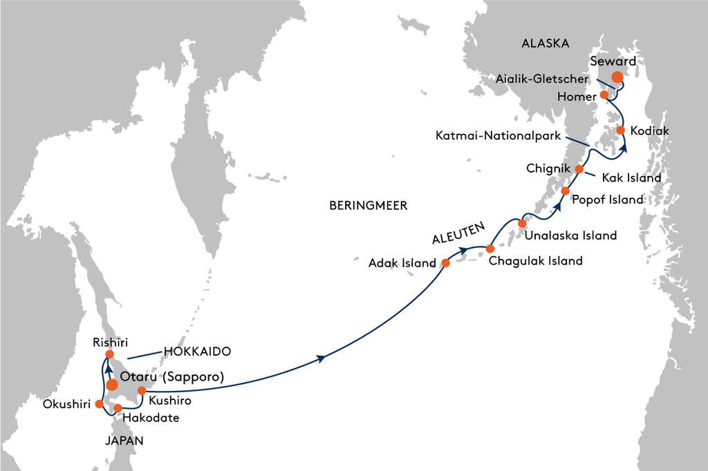 Reiseverlauf abhängig von behördlichen Genehmigungen und Wetterlage. Beschriebene Naturerlebnisse/Tiersichtungen sind mögliche Ereignisse auf dieser Reise und nicht garantiert. Nach heutigem Stand ist der Einsatz von bordeigenen Zodiacs in Alaska behördlich nicht erlaubt und in Japan vorbehaltlich behördlicher Genehmigung. Liegt das Schiff auf Reede, kommen in Alaska bordeigene Tenderboote zum Einsatz.