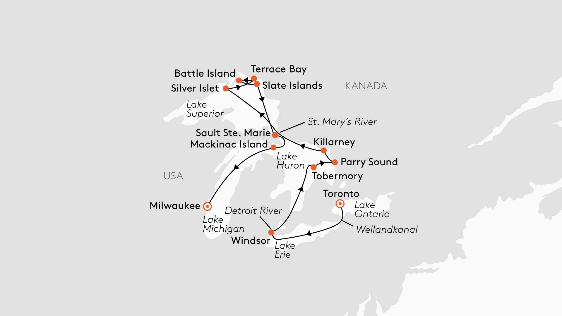 * Die Landaktivitäten sind nicht im Reisepreis enthalten und in Planung. Änderungen vorbehalten. Reiseverlauf abhängig von behördlichen Genehmigungen. Der Einsatz von bordeigenen Zodiacs auf dem Lake Superior ist nur auf der kanadischen Seite erlaubt. Liegt das Schiff auf Reede in den USA, kommen bordeigene Tender zum Einsatz.