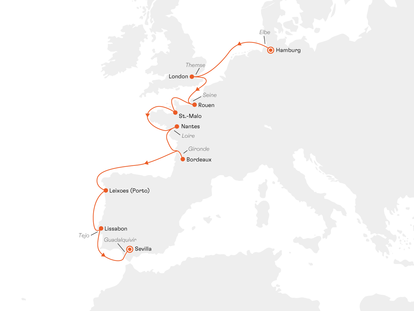 - Liegezeiten über Nacht in London, Rouen, Bordeaux, Lissabon und Sevilla