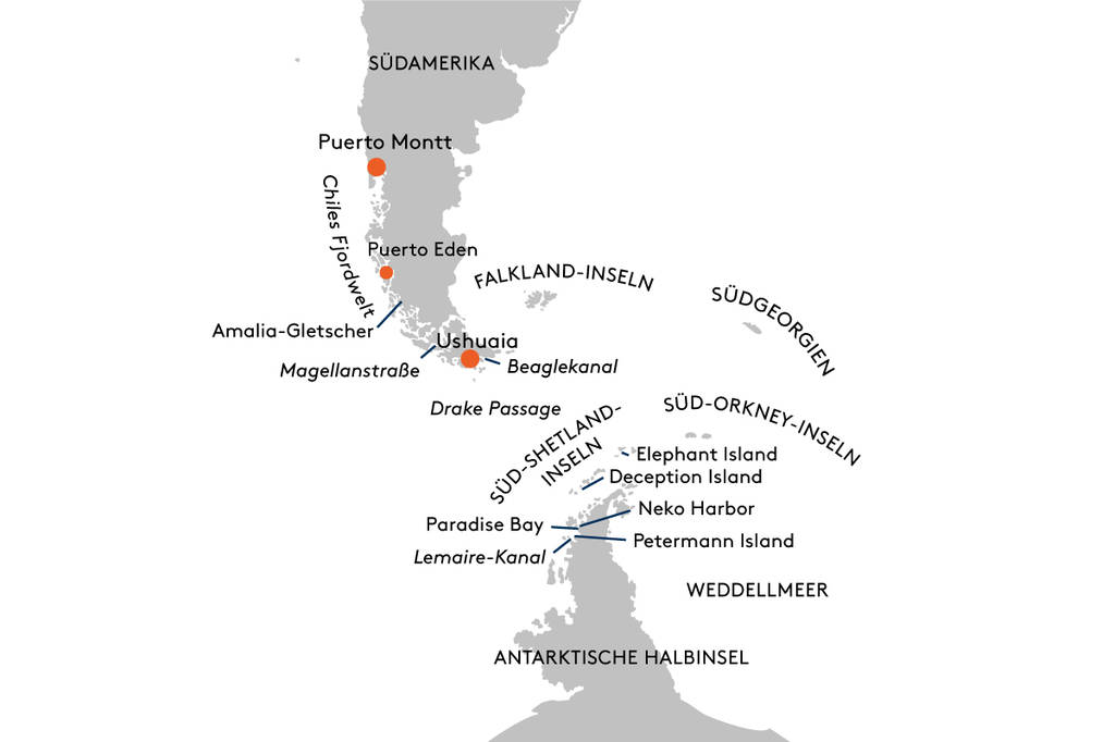 - Neue Route, gleich zweimal im Programm! Ob über Weihnachten und Silvester oder Ende Januar – diese Expedition vereint Wunder aus Fels und Eis. Eine Kombination aus dem Kreuzen in Chiles zerklüfteter Fjordwelt und den Abenteuern in den schönsten Regionen der Antarktis.