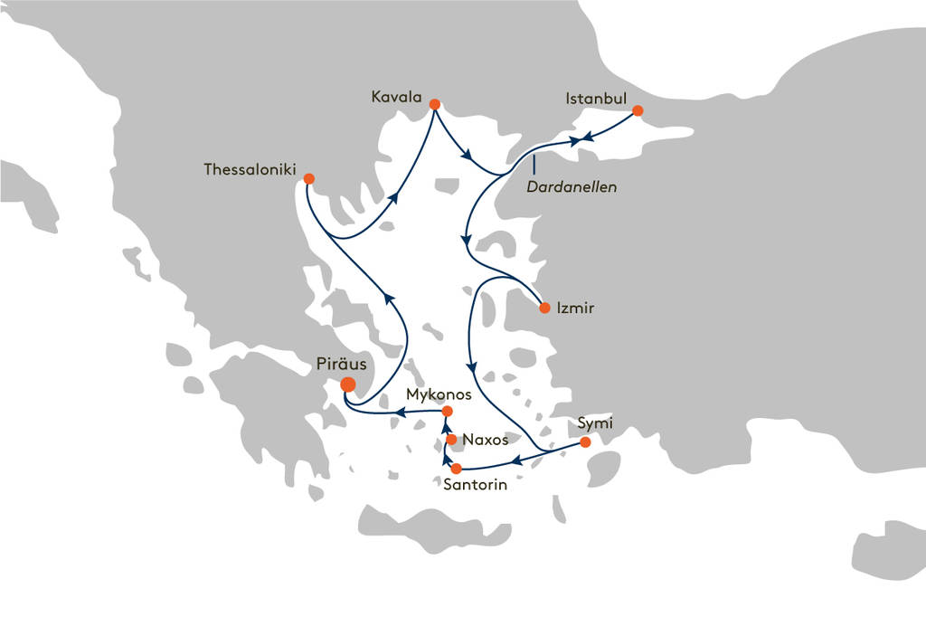 Vom grünen Norden Griechenlands über die legendären Dardanellen in das multikulturelle Istanbul, danach Natur pur auf den blau-weißen Inseln der Götter – willkommen zu abwechslungsreichen Tagen zwischen Abendland und Orient.