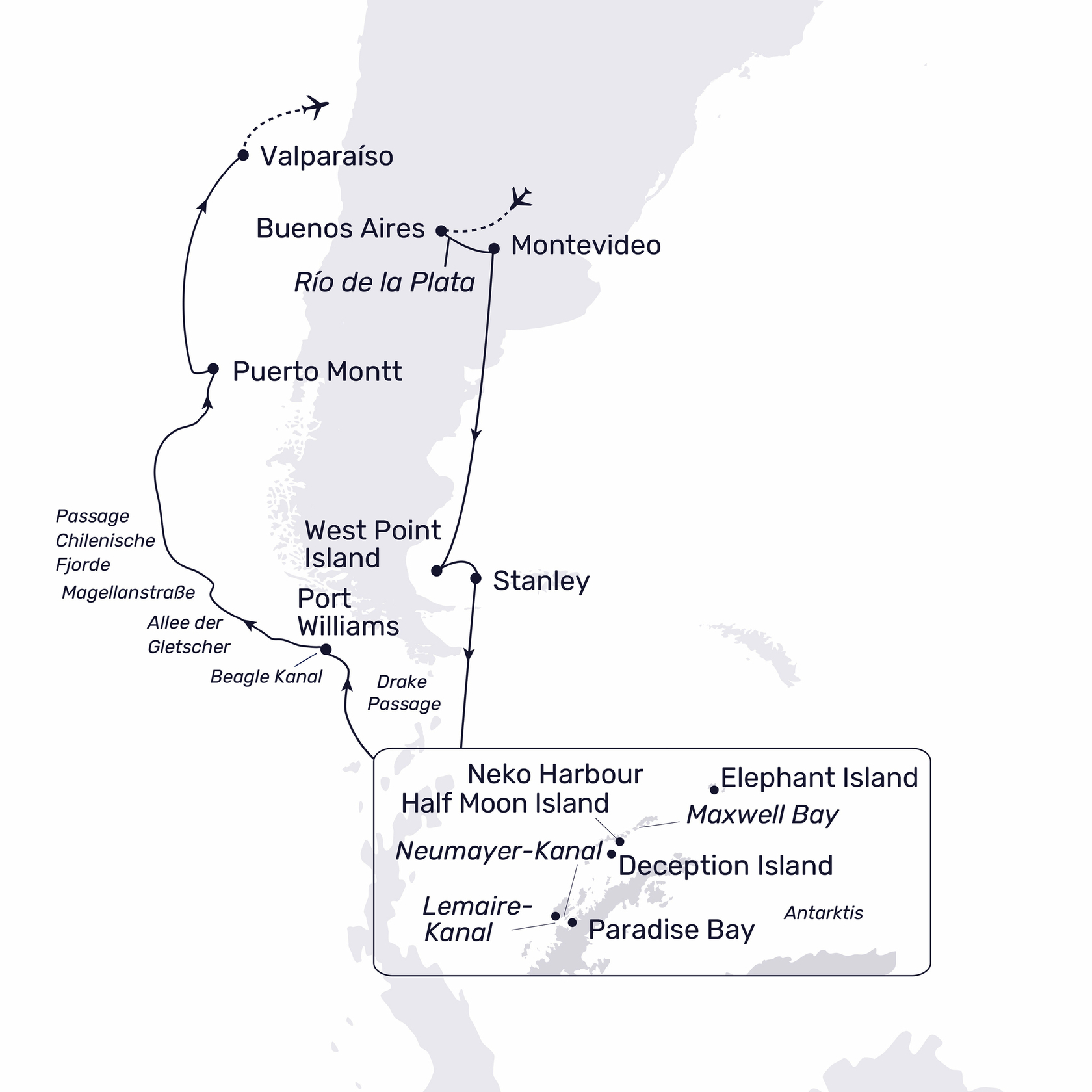 Von Buenos Aires bis Valparaíso eröffnen sich beeindruckende Horizonte zu den entlegensten und spektakulärsten Orten der Erde. Nach einem Stopp in Montevideo erwarten die wildromantischen Falklandinseln mit West Point Island und Stanley, bevor das Abenteuer Antarktis beginnt. Auf Half Moon Island, Deception Island und in der Paradise Bay beeindrucken schneebedeckte Gipfel, mächtige Gletscher und lebendige Pinguinkolonien. Anschließend führen die legendäre Drake Passage und die Magellanstraße zu den majestätischen chilenischen Fjorden und Puerto Montt. Eine Expedition auf hoher See, die Entdeckerträume Wirklichkeit werden lässt, und unvergessliche Naturschönheiten, Ruhe und Abenteuer in perfektem Zusammenspiel bietet.