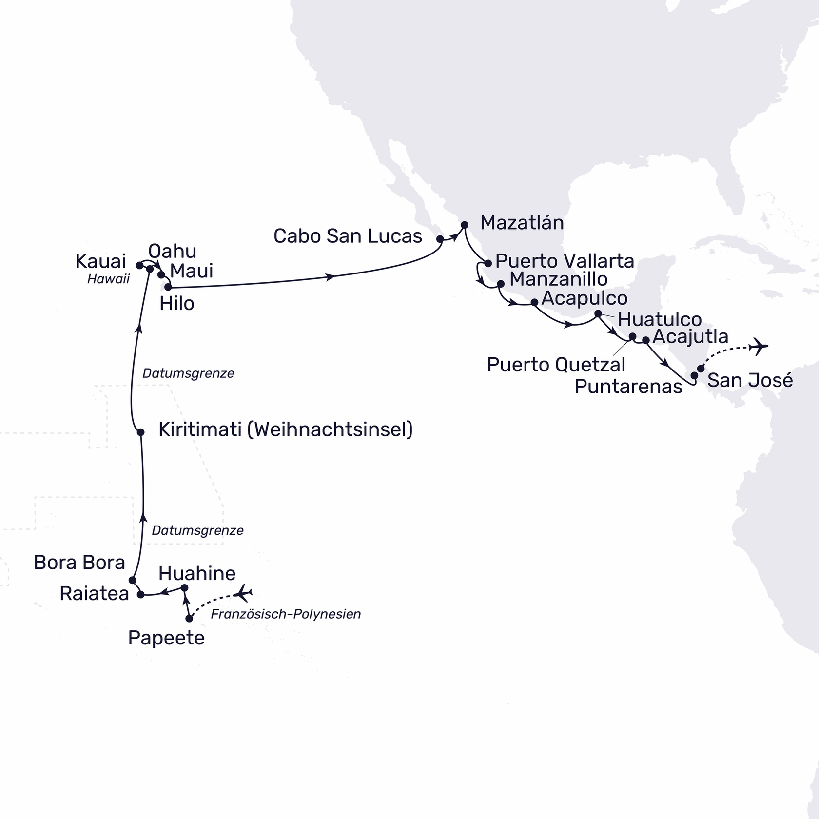 Papeete – Französisch-Polynesien – Kiribati – USA – Mexiko – Guatemala – El Salvador – Puntarenas/Costa Rica