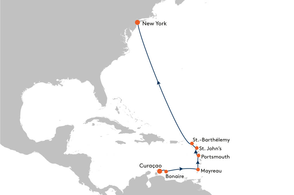 Auf Curaçao begrüßt Sie die EUROPA 2 im Hafen von Willemstad zu einer exklusiven Reise durch die Karibik. Pinkfarbene Flamingos, Kolibris und Papageien – Bonaire beeindruckt als erstes Ziel mit einer einmaligen Tierwelt. Genießen Sie erholsame Stunden auf einer Dschunke*, die Sie zum Eiland „Klein Bonaire“ bringt, oder erkunden Sie das farbenfrohe Kralendijk mit einem der typischen Elektro-Tuk-Tuks*. Mayreau, die kleinste der bewohnten Inseln der Grenadinen, empfängt Sie nach einem entspannten Seetag mit langen karibischen Sandstränden und kristallklarem Wasser. Auch Dominica wird Sie von Portsmouth aus mit einem Ausflug in den Regenwald am Fuße des Morne Diablotins* faszinieren. Von Palmen gesäumte Ufer zieren die Küste von St. John’s auf Antigua. Unvergessliche Erlebnisse warten dort auf Sie beim Schwimmen mit Stachelrochen* oder bei einem Helikopterflug* über das Karibische Meer zur bezaubernden Nachbarinsel Montserrat. Das paradiesisch anmutende Eiland St.-Barthélemy ist seit Jahrzehnten ein beliebter Rückzugsort bekannter Persönlichkeiten. Eine Katamaranfahrt* entlang der Küste verspricht Naturimpressionen und die Gelegenheit zum Baden im Meer. An drei erholsamen Seetagen können Sie das Erlebte Revue passieren lassen, während die Vorfreude auf New York steigt, wo Ihre Reise ihr fulminantes Ende findet. Eine Übernachtung an Bord im Hafen der Stadt, die niemals schläft, bietet Ihnen zum Abschluss die Gelegenheit, Lower Manhattan bei Tag und Nacht individuell oder bei einem Ausflug* zu erkunden. *Die Vor- und Nachprogramme sowie die Landaktivitäten sind nicht im Reisepreis enthalten und in Planung. Änderungen vorbehalten.
