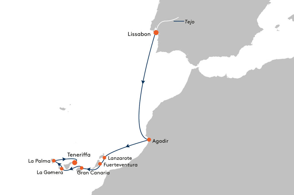 In Lissabon empfängt Sie die EUROPA 2 an Bord. Genießen Sie bei einer Stadterkundung mit der historischen Straßenbahn* die engen Gassen sowie einzigartige Blicke auf die berühmten Sehenswürdigkeiten, bevor Ihre Reise mit einer der malerischsten Flussfahrten Europas beginnt. In den Ausläufern des Antiatlas-Gebirges gelegen, begrüßt Sie das majestätische Agadir. Ein Besuch von Marrakesch*, der faszinierendsten Stadt Marokkos, lässt Sie in ein Märchen aus 1.001 Nacht eintauchen. Aktiver geht es auf Lanzarote zu: Erkunden Sie mit wendigen zweisitzigen Elektroautos* die beeindruckende Vulkaninsel, oder begeben Sie sich auf die Spuren des Künstlers Cesar Manrique*, der vor allem für seine architektonischen Projekte und seinen entscheidenden Einfluss auf die nachhaltige Entwicklung von Lanzarote bekannt ist. Fuerteventura lädt zu einem Buggy-Offroad-Abenteuer* zu versteckten Tälern und ursprünglichen Dörfern ein, ehe auf Gran Canaria die unter Naturschutz stehenden Sanddünen von Maspalomas* beeindrucken. Agulo* gilt mit seinen alten Kolonialbauten und verwinkelten Straßen als das schönste Dorf von La Gomera – besuchen Sie es während einer Inselfahrt*, ebenso wie den zum UNESCO-Welterbe zählenden Garajonay-Nationalpark*. Verwunschene Urwälder erwarten Sie zum Abschluss auf La Palma während einer Wanderung*, bevor Ihre Reise zu den Schätzen des Atlantiks auf der größten Insel der Kanaren, dem reizvollen Teneriffa, zu Ende geht. *Die Vor- und Nachprogramme sowie die Landaktivitäten sind nicht im Reisepreis enthalten und in Planung. Änderungen vorbehalten.