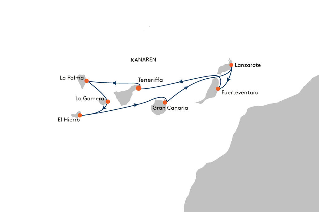 Beginnen Sie Ihr Inselhopping durch die Welt der Kanaren auf Teneriffa. Nach einem entspannten Tag auf See begrüßt Sie La Palma mit der Hauptstadt Santa Cruz. Die beeindruckende Landschaft, imposante Vulkane sowie ruhige Strände brachten der Insel den Beinamen „La Isla Bonita“ ein. Tags darauf lädt La Gomera zur Wal- und Delfinbeobachtung* ein, bevor die Nachbarinsel El Hierro Ihnen bei einer Wanderung* wunderbare Ausblicke bietet. Gran Canaria wird Sie mit den weitläufigen Sanddünen von Maspalomas* und dem idyllischen Puerto de Mogan* ebenso in seinen Bann ziehen wie die vulkanisch geprägte Landschaft Lanzarotes. Begeben Sie sich hier auf die Spuren von Cesar Manrique, dem wohl bekanntesten Einwohner der Insel, und besuchen Sie seine imposanten Bauwerke*. Ein einmaliges Buggyabenteuer* erleben Sie auf Fuerteventura, offroad erreichen Sie das vulkanische Hinterland mit seinen versteckten Tälern und Dörfern. Auf Teneriffa eröffnet Ihnen ein Ausflug mit dem Katamaran* die Möglichkeit, neben den traumhaften Ausblicken auf das Meer und die Küste das kristallklare Wasser eines Naturschutzgebietes bei einem erfrischenden Bad zu genießen. Alternativ bietet La Orotava*, eines der schönsten und sicher auch typischsten Städtchen der kanarischen Inselwelt, die perfekte Kulisse, bevor sich Ihre Reise in der Hauptstadt Teneriffas dem Ende entgegenneigt. *Die Vor- und Nachprogramme sowie die Landaktivitäten sind nicht im Reisepreis enthalten und in Planung. Änderungen vorbehalten.