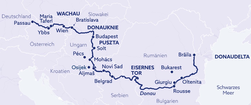 Es gibt wohl keine bequemere Möglichkeit, in nur zwei Wochen acht Länder zu bereisen. Dabei gilt: Die Mischung machts! Besichtigungen der Metropolen Wien, Budapest, Belgrad und Bukarest wechseln sich ab mit entspannten Flusstagen und erholsamen Stunden auf dem Sonnendeck. Dort, wo die Donau die Katarakte durchbricht, zieht eine majestätisch schöne Landschaft gemächlich vorbei. Natürliche Harmonie empfängt Sie schließlich dort, wo sich die Natur noch im Gleichgewicht befindet: Das Donaudelta ist Heimat von Pelikanen, Silberreihern, Ottern und zahlreichen Fischarten.