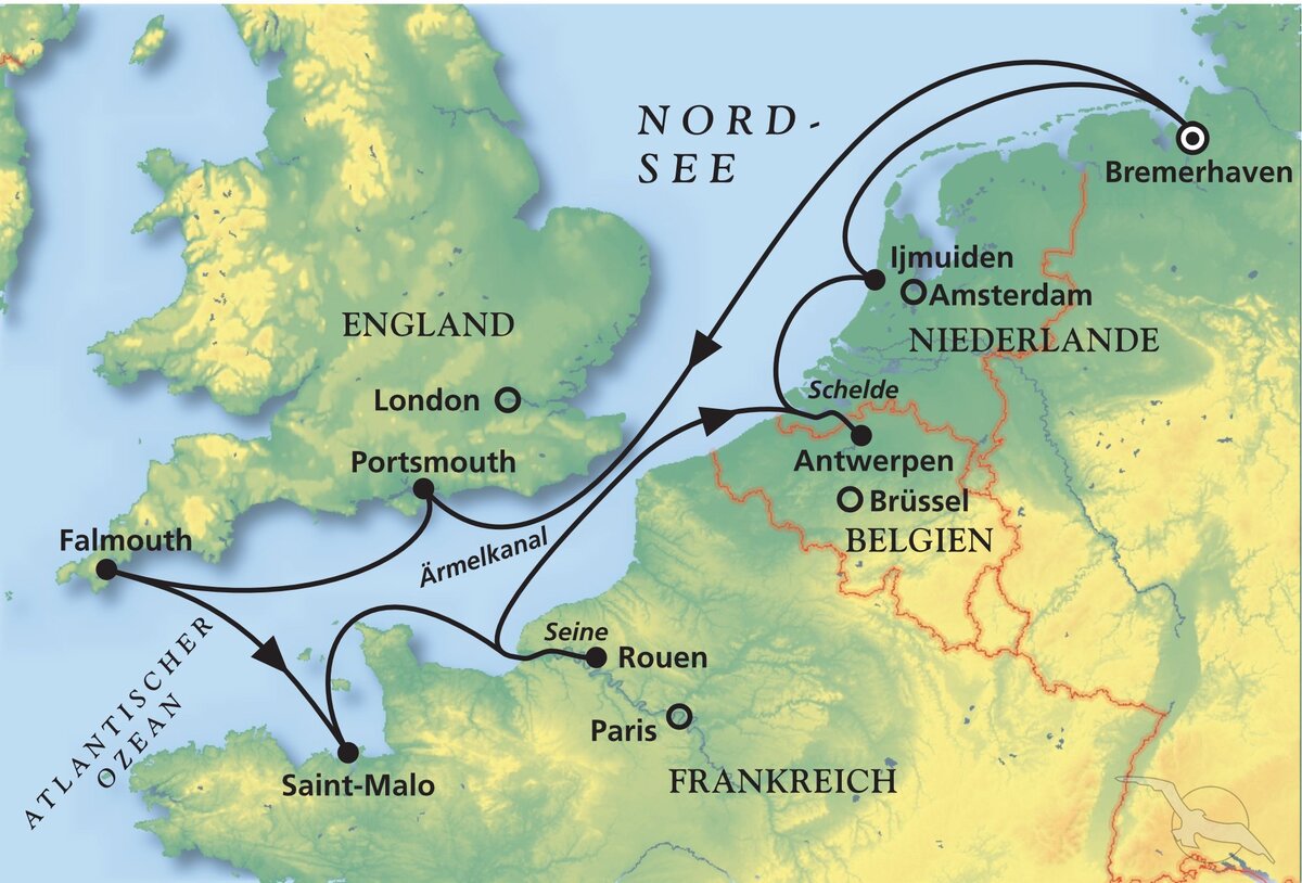 Bremerhaven - Portsmouth - Falmouth - Saint-Malo - Rouen - Antwerpen - Ijmuiden (Amsterdam) - Bremerhaven