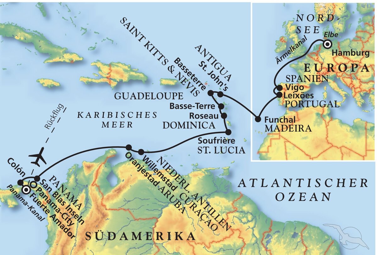 Hamburg - Vigo - Funchal - Basseterre - Roseau - Willemstad - Oranjestad - Colón - Panama-Kanal - Fuerte Amador