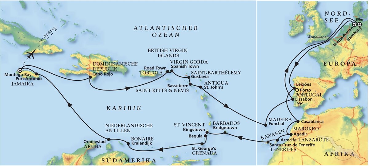 Bremerhaven - Casablanca - Santa Cruz de Tenerife - Bridgetown - Montego Bay - Basseterre - St. John´s - Funchal - Lissabon - Hamburg