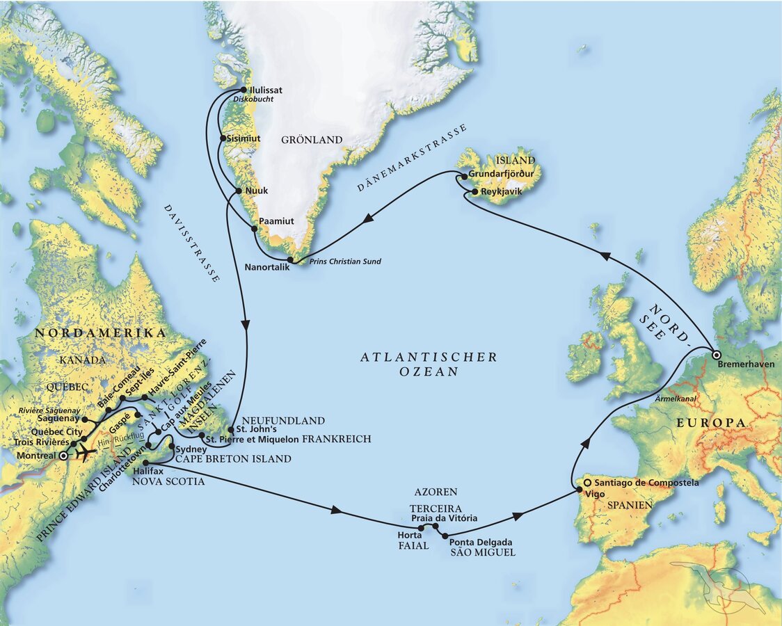 Bremerhaven - Reykjavik - Ilulissat - Sisimut - Nuuk - Québec City - Montreal - Halifax (Nova Scotia) - Saguenay - Bremerhaven