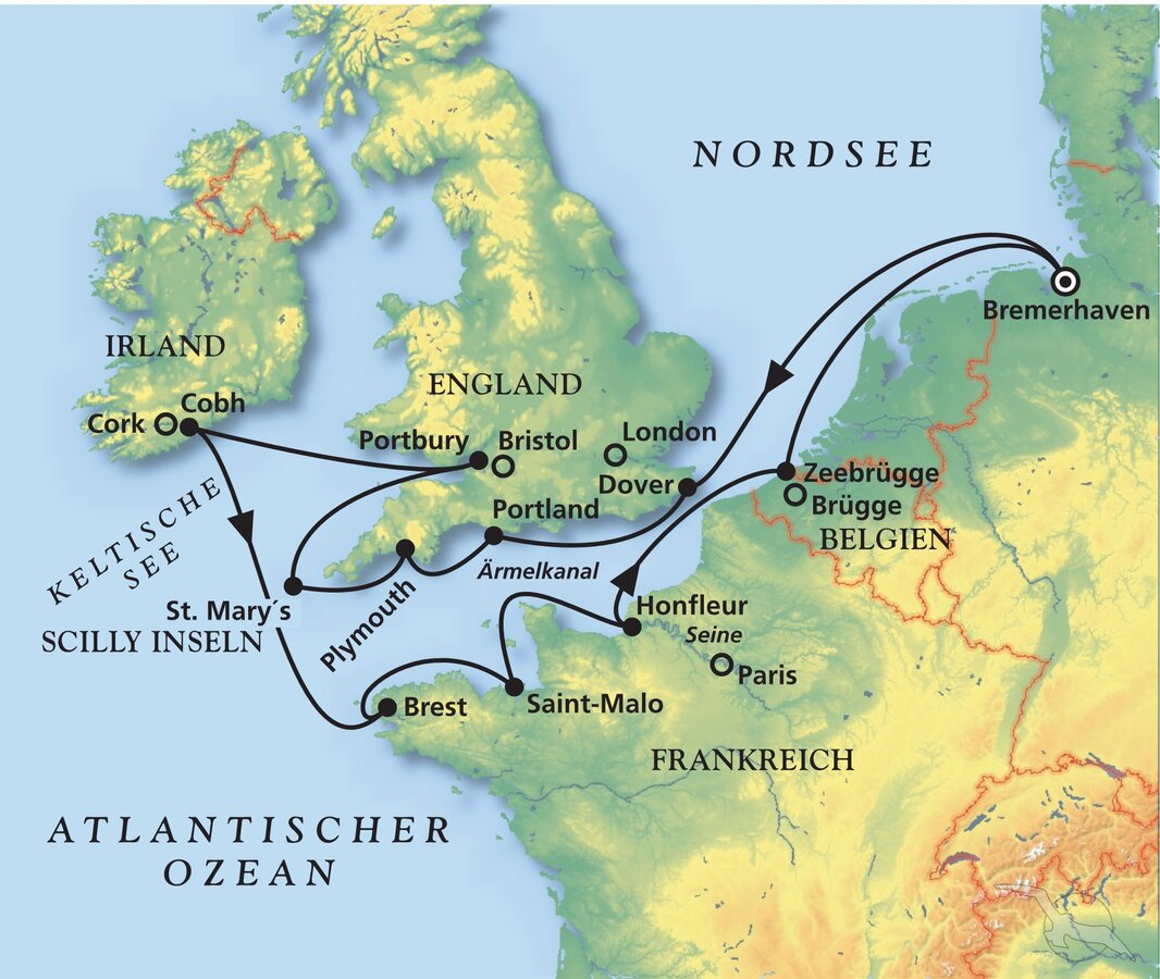 Bremerhaven - Dover - Portland - Scilly Inseln - Cobh - Saint-Malo - Honfleur - Brügge - Bremerhaven