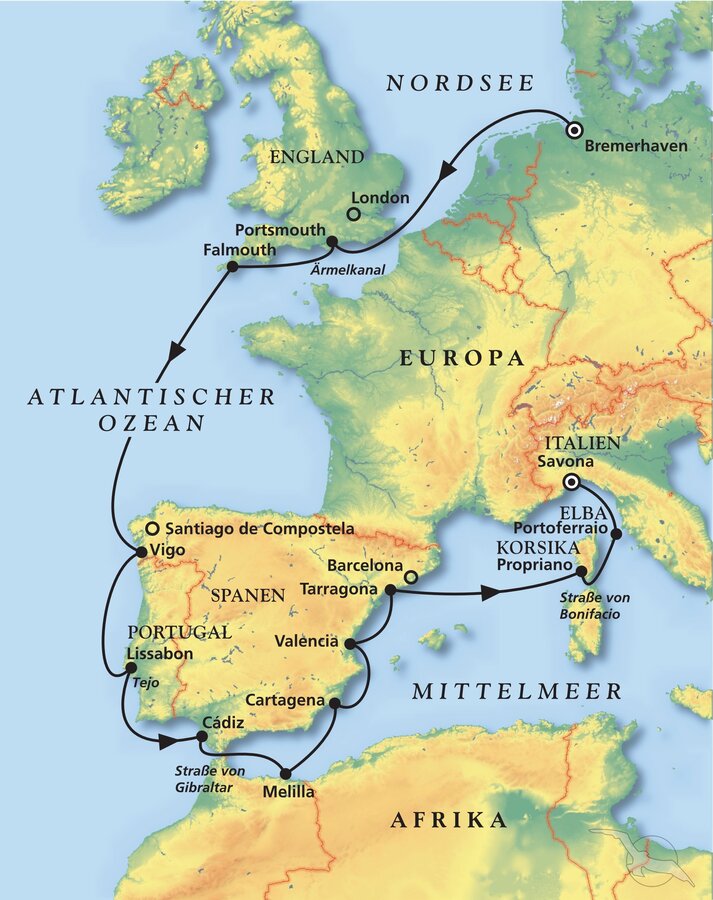 Bremerhaven - Portsmouth - Vigo - Lissabon - Cádiz - Cartagena - Valencia - Tarragona - Portoferraio - Savona