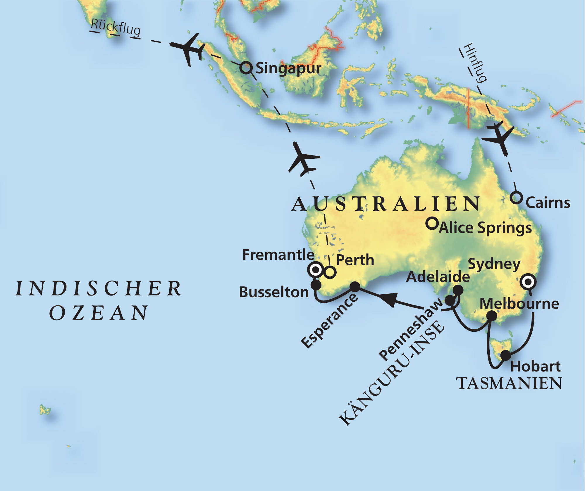 Cairns - Sydney - Hobart - Melbourne - Adelaide - Esperance - Busselton - Fremantle - Singapur