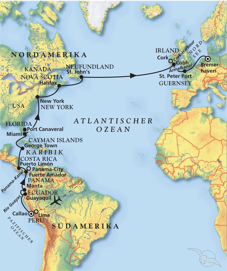 Callao (Lima) - Guayaquil - Panama-Kanal - Puerto Limón - Miami - New York - Halifax - Cobh - Bremerhaven