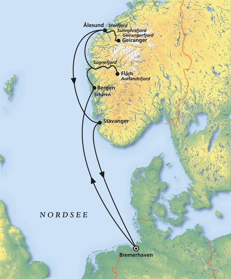 Bremerhaven - Bergen - Flåm - Alesund - Geiranger - Stavanger - Bremerhaven