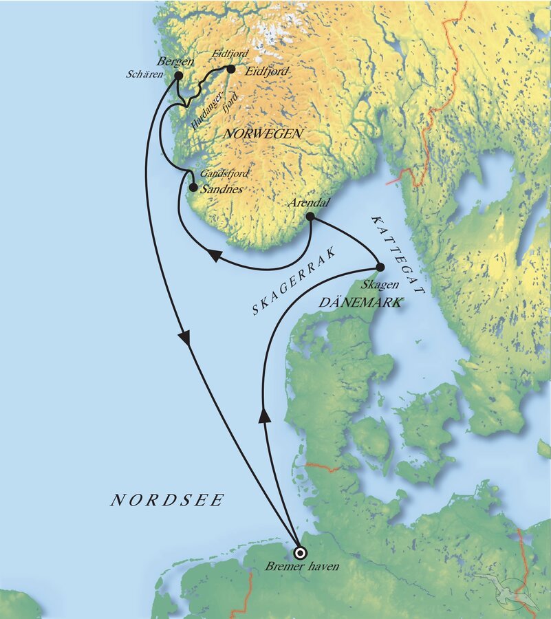 Bremerhaven - Skagen - Arendal - Sandnes - Eidfjord - Bergen - Bremerhaven