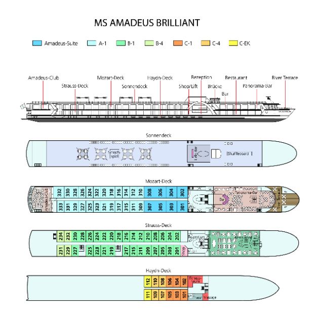 Die AMADEUS Brilliant verfügt über 2 Einzelkabinen (C-EK), die ohne Zuschlag buchbar sind.