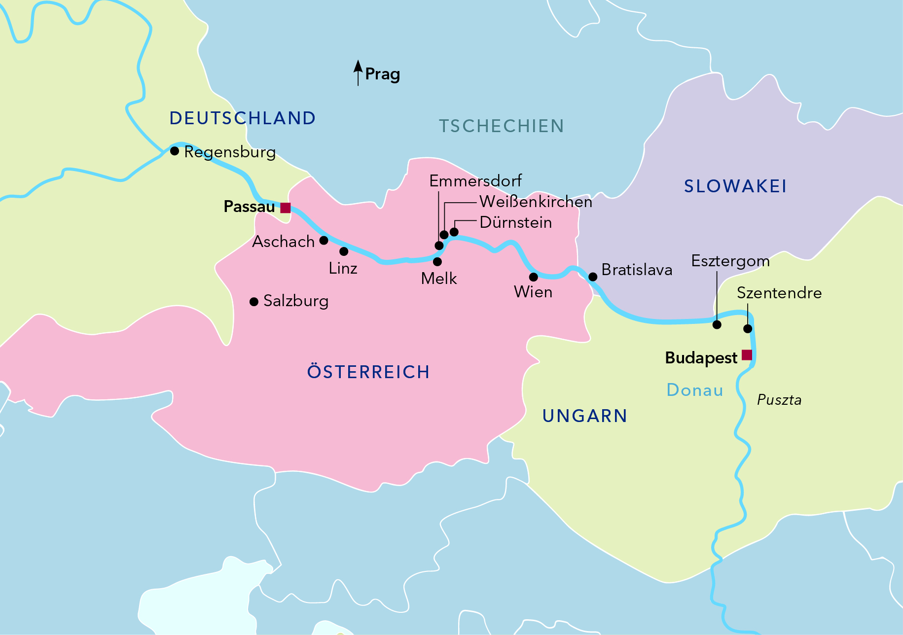 Von der Dreiflüssestadt Passau in die Prunkstadt Budapest und wieder zurück: Auf dieser Strecke erleben Sie die mehrere tausend Jahre alte Kulturgeschichte Europas hautnah. Von Deutschland reisen Sie über Österreich und die Slowakei bis nach Ungarn und erkunden auf Ihrem Weg weltberühmte Hauptstädte wie Wien, Budapest und Bratislava, bedeutende kulturelle Sehenswürdigkeiten wie das imposante Stift Melk oder die Basilika von Esztergom.