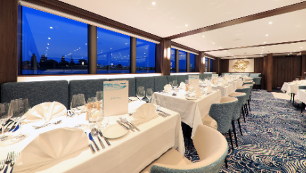 - Vollpension an Bord (beginnend mit dem Abendessen des ersten Tages, endend mit dem Frühstück am letzten Tag): Frühstücksbuffet, mehrgängiges Mittag- und Abendessen, Nachmittagskaffee/Tee, Mitternachtssnack. Gehobene europäische Küche.