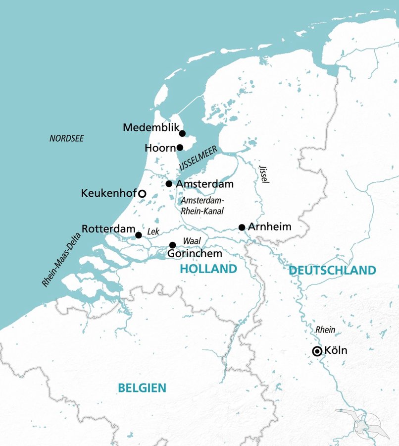 - Köln - Amsterdam - Ijsselmeer - Medemblik - Hoorn - Rotterdam - Gorinchem - Arnheim - Köln