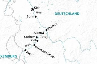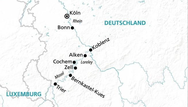 - Köln - Cochem - Zell - Trier - Bernkastel-Kues - Alken - Koblenz - Bonn - Köln