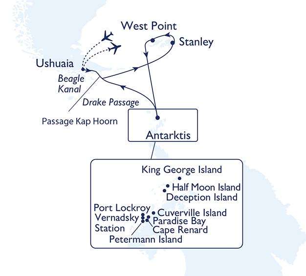 Hinweis: Die Anlandungen auf den Falklandinseln und in der Antarktis sind wind-, wetter- und eisabhängig. Der genaue Fahrplan wird vom Kapitän vor Ort festgelegt. AR - Schiff liegt auf Reede. Ausbooten wetterabhängig. (H) Halbtagesausflug