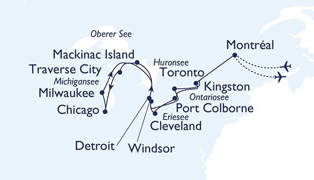 Während der Indian Summer die kanadischen Wälder kunterbunt verfärbt, fahren Sie entspannt den St.-Lorenz-Strom entlang und genießen das Panorama an den Ufern. Was Sie auf dieser Reise wohl alles erwartet? In Kanada entdecken Sie bei einer Rideau Canal Tour die malerischen Wasserwege rund um Kingston oder bestaunen das Tosen der Niagarafälle. In den USA erkunden Sie Cleveland, Detroit und Chicago, verlieben sich in den Huron- und den Michigansee, besuchen das Harley-Davidson Museum in Milwaukee oder das imposante Fort auf Mackinac Island. Den Detroit River und den St. Clair See passiert, heißt Sie Kanada erneut willkommen. Der 43 km lange Wellandkanal und die Millionenstadt Toronto dürfen auf dieser Reise einfach nicht fehlen.