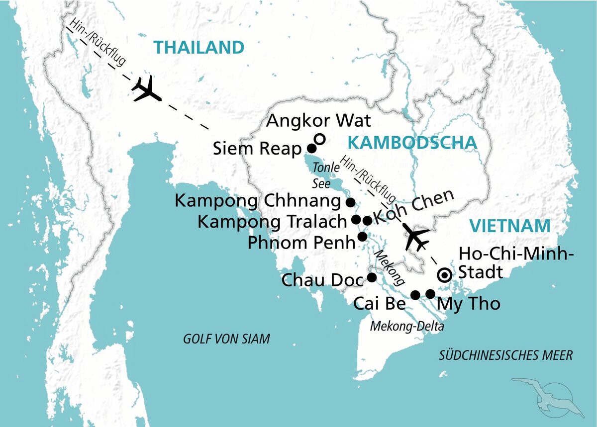 Es erwartet Sie eine außergewöhnliche Kombinationsreise durch Vietnam und Kambodscha. Während Ihrer Kreuzfahrt auf MS Lan Diep lässt es sich besonders gut entschleunigen. Sie kreuzen auf dem Mekong, durch kleine Kanäle und Wasserstraßen und besuchen verschiedene landestypische Dörfer entlang der Ufer. Wir nehmen Sie im Anschluss mit zu den schönsten Tempeln, wie z.B. der bekanntesten Anlage Angkor Wat in Siem Reap, und zeigen Ihnen das wirtschaftliche Zentrum Vietnams - Saigon/Ho-Chi-Minh-Stadt. Sie können Ihre Reise mit einem Stopover in Bangkok oder einem Badeaufenthalt in Phuket verlängern. Nähere Informationen - ein Anruf genügt!