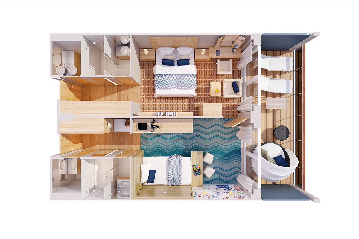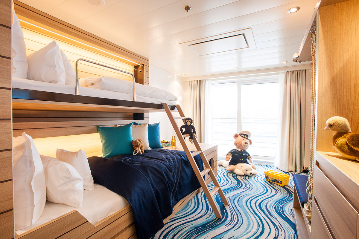 Hier fühlen sich alle wohl. Viel Platz für Sie und Ihre ganz persönlichen Wünsche – das macht einen entspannten Familienurlaub aus. Im Familien Appartement wohnen Eltern und Kinder in zwei getrennten Bereichen, die durch eine Tür und über den Balkon miteinander verbunden sind. Einer der Wohnbereiche ist in seiner Ausstattung explizit auf unsere jüngeren Kreuzfahrer zugeschnitten.