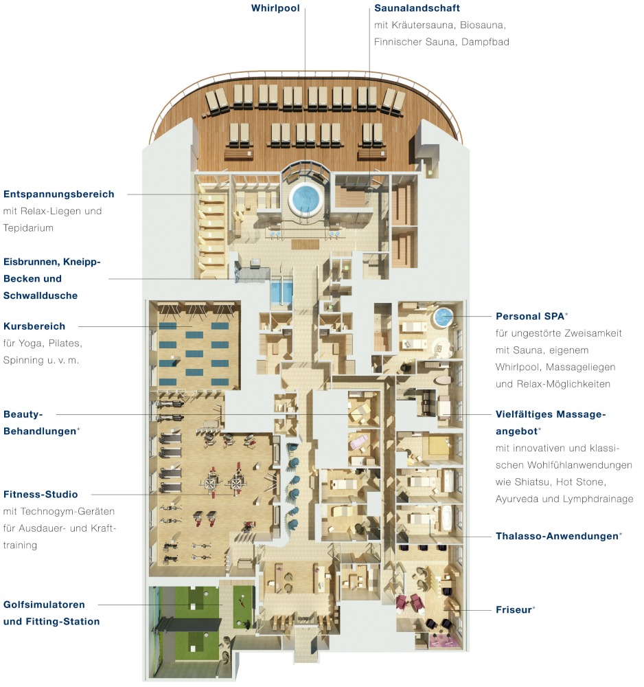 Im großzügigen OCEAN SPA erwarten Sie auf über 800 m² alle Möglichkeiten, um Körper und Geist zu vitalisieren. Und damit Sie nie vergessen, wo Sie sich befinden, haben Sie immer eine fantastische Sicht auf das weite Meer.