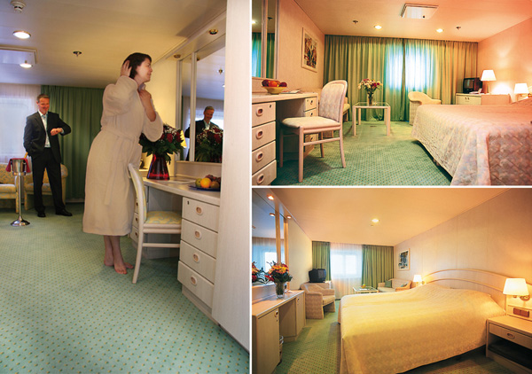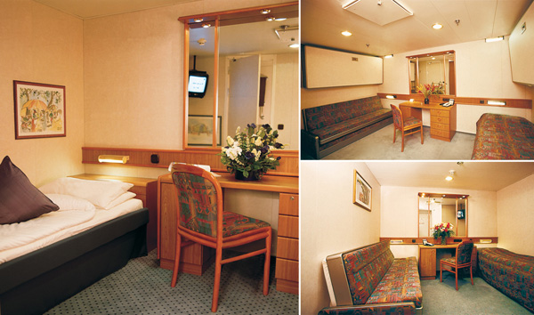 | Kabinenausstattung: | Die hellen und freundlich eingerichteten Nichtraucher-Kabinen sind mit zwei separaten Unterbetten ausgestattet (Kategorie A/B/C/D/E). In einigen Kabinen der Kategorien A/B/C/D/E befinden sich zusätzliche Oberbetten, die tagsüber eingeklappt und abends vom Hotelpersonal für die Nachtruhe wieder hergerichtet werden. Zur Einrichtung gehören Bad mit Dusche/WC und Föhn, individuell regulierbare Klimaanlage, Safe, Telefon, Flatscreen-TV/Bordradio sowie Schreibtisch/Stuhl. Die Komfort- und Luxuskabinen der Kategorien F/G sind mit einem Doppelbett, Sitzecke und Minibar ausgestattet. Die Suiten in der Kategorie H sind ebenfalls mit Doppelbett und außerdem mit Badewanne/Whirlpool und einem vom Schlafraum getrennten Salon mit Minibar eingerichtet. |