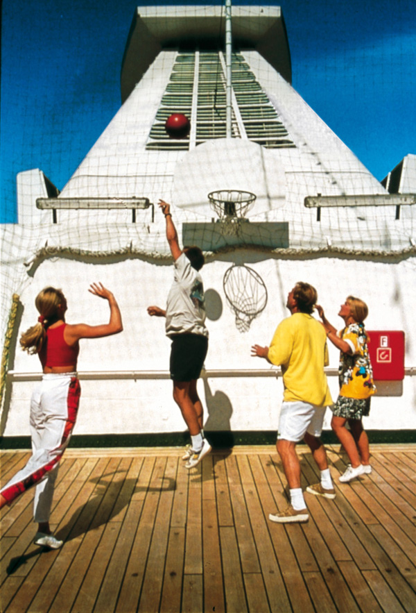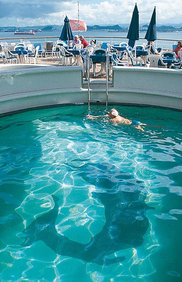 • Weitläufige Deckflächen zum Sonnen • Rundum Teakholzpromenade • Beheizbarer Swimmingpool • Spielfeld für Volley- & Basketball • 3 Bars • Discothek • Grand Salon für Entertainment • Nichtraucher-Restaurant Pazifik mit Meerblick • Elegante Weinbar • Bücherei • Bordshop • Parfümerie
