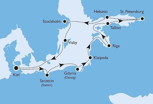 Prachtvolles Erbe der Hanse in Stettin und Danzig bestaunen. Bestes Bier in Klaipeda, Riga und Tallinn probieren, umgeben von liebevoll restaurierten Altstädten. Dann das prachtvolle St. Petersburg, Gestalt gewordene Vision Peters des Großen. Zwei Tage lang Glanz und Zauber der Zarenmetropole genießen. Weiter nach Helsinki mit seinen klassizistisch klaren Bauten und nach Stockholm inmitten seiner romantischen Schärenlandschaft. Mauerbewehrtes Weltkulturerbe auch die mächtige alte Hansestadt Visby auf Gotland, einst „Königin des Meeres“ und Zuflucht der Vitalienbrüder.