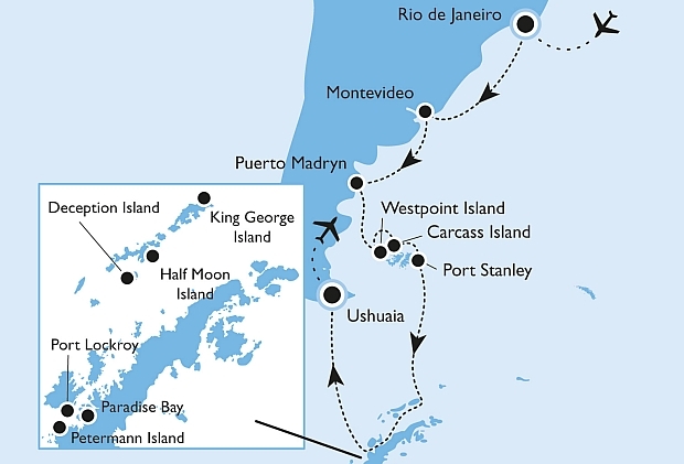 Reisen Sie über Rio, Montevideo, die Halbinsel Valdez zu den Falklandinseln und in die Antarktis!