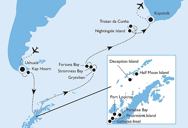 Galindez-Insel Petermann Island Lemaire Kanal Port Lockroy Neumeyer Kanal Paradise Bay Deception Island Half Moon Island Elephant Island Drygalski Fjord Grytviken Stromness Bay Fortuna Bay |