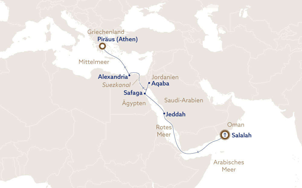 Salalah - Saudi-Arabien - Ägypten - Jordanien - Suezkanal - Athen