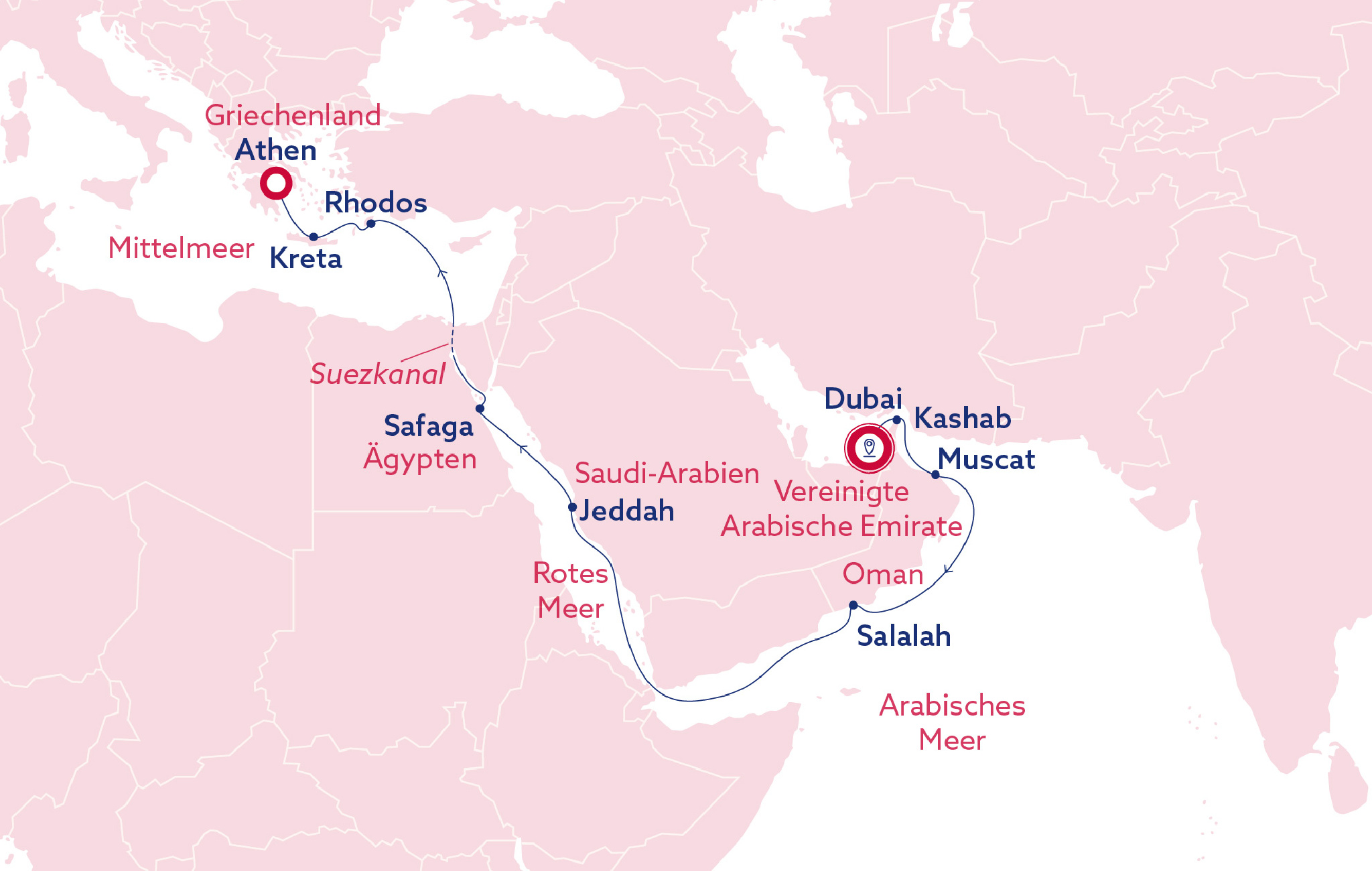 Sie starten in Dubai mitten im Hier und Jetzt – wenn nicht sogar in der Zukunft. Von hier aus nimmt die VASCO DA GAMA Sie mit auf eine faszinierende Reise in die Vergangenheit und sogar in die Geschichten aus 1001 Nacht! Im Oman und in Saudi-Arabien werden Sie beinahe magische Momente erleben und zwischen den Zeiten hin- und herreisen. Im ägyptischen Safaga werden Sie den Eindruck haben, an den Ursprung der Zivilisation zurückzukehren. Und auf den griechischen Inseln entdecken Sie die Wiege der ersten europäischen Hochkultur. Wenn Sie nach 16 Tagen in Athen von Bord gehen, werden Sie unendlich viele unvergessliche Erlebnisse mitnehmen!